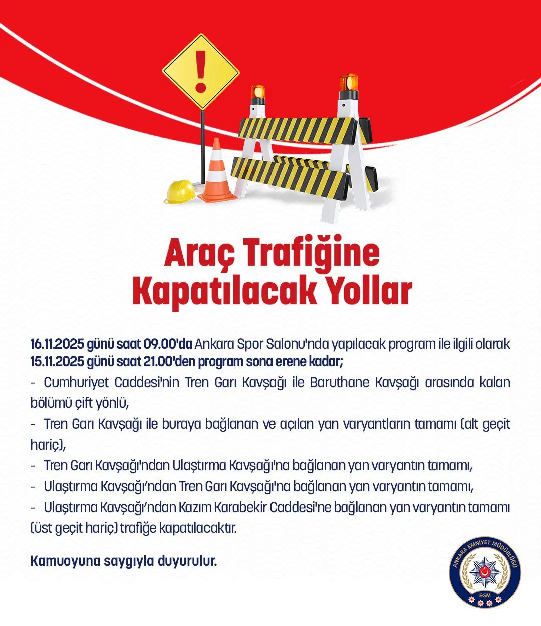 Cumhuriyet Caddesi’nin Tren Garı ile Baruthane kavşakları arasında kalan bölümü çift yönlü, Tren Garı Kavşağı ile buraya bağlanan ve açılan yan varyantların alt geçitler hariç tamamı, Tren Garı Kavşağı’ndan Ulaştırma Kavşağı’na bağlanan yan varyantların tamamı, Ulaştırma Kavşağı’ndan Tren Garı Kavşağı’na bağlanan yan varyantın tamamı ve Ulaştırma Kavşağı’ndan Kazım Karabekir Caddesi’ne bağlanan yan varyantın üst geçitler hariç tamamı, program sona erene kadar trafiğe kapalı olacak.