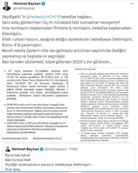Seydişehir Belediyesi’nde 5393 Sayılı Belediye Kanunu’nun 25. maddesi kapsamında hazırlanan ve denetim komisyonu üyelerinin muhalefet şerhiyle sunduğu raporu Nisan ayında paylaşan Baykan, o dönemde CHP’de olan Ustaoğlu için şu ifadeleri kullanmıştı: