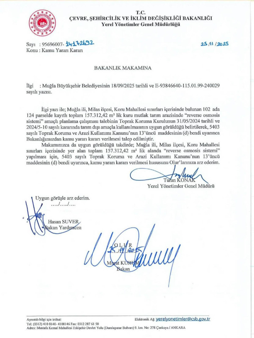 Projenin uygulanacağı Milas Koru Mahallesi’ndeki 157 bin 312 metrekarelik tarım arazisinin kullanımı, Toprak Koruma Kurulu’nun olumlu görüşü doğrultusunda onaylandı. Reverse osmosis teknolojisiyle deniz suyunu içilebilir hale getirecek tesis sayesinde, Milas’ın Güllük, Boğaziçi, Dörttepe, Kemikler, Kazıklı, Kızılağaç, Gürçamlar, Kıyıkışlacık ve Bozbük mahalleleri ile Bodrum’un tüm yerleşimlerine kesintisiz ve sürdürülebilir içme suyu sağlanacak.